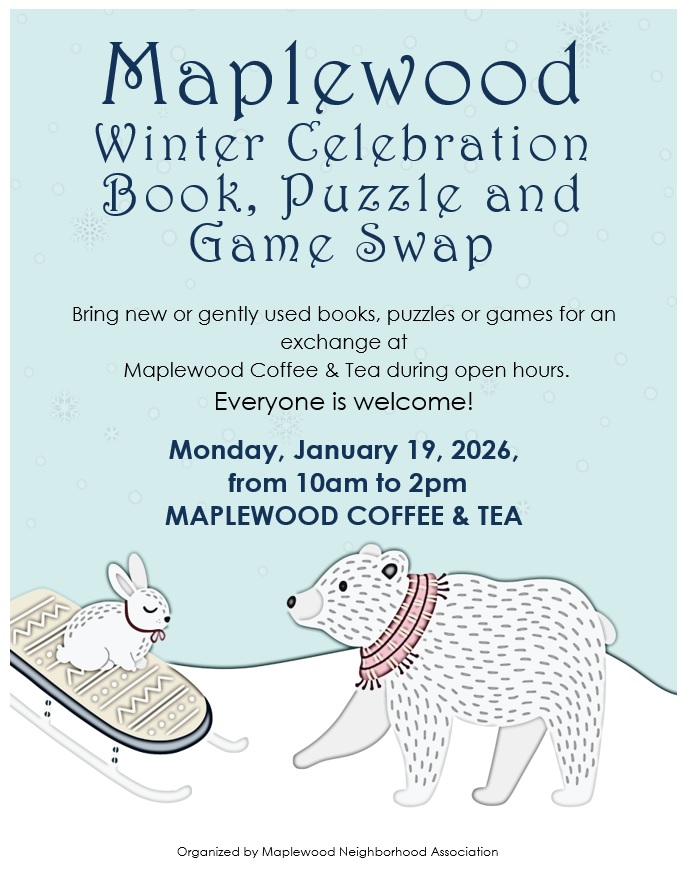 Monday, January 19, Martin Luther King Day, 10:00 am-2:00 pm at Maplewood Coffee and Tea — Book, Puzzle, Game Swap.