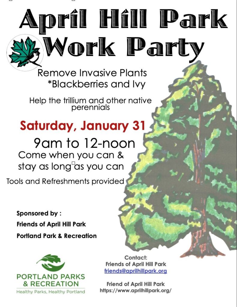 In November 2025 twenty-eight wonderful volunteers removed blackberry and ivy in April Hill Park’s natural area. The volunteers did a great job. A big thank you! Now we want to remove more blackberry and ivy with a January work party letting the trillium and other native perennials grow freely this spring.
