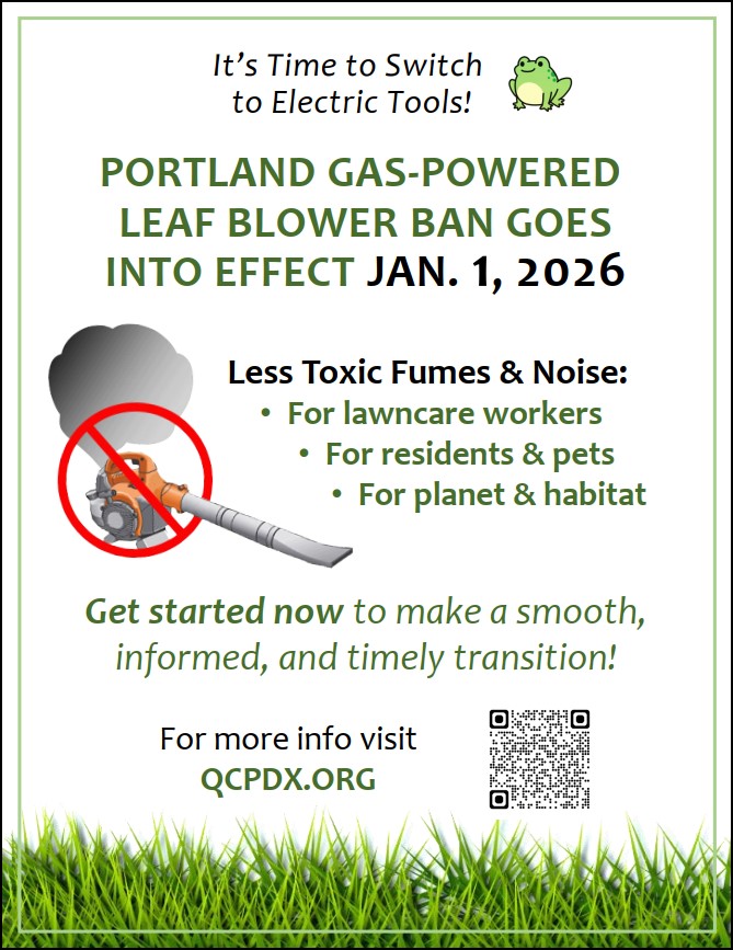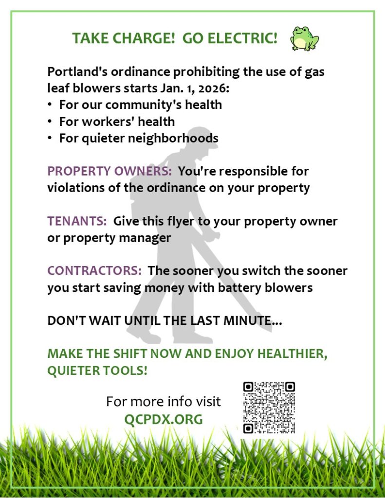 Starting next year, the only time gas leaf blowers will be allowed to be used in the city of Portland will be during the wet season of Oct – Dec of 2026 and 2027. Starting in 2028, gas blowers will be banned for good. Start looking now for an electric or battery operated one and be sure to tell any contractors or property managers that you hire. The property owner is responsible for any violations, not the contractor or property manager. More information here.
